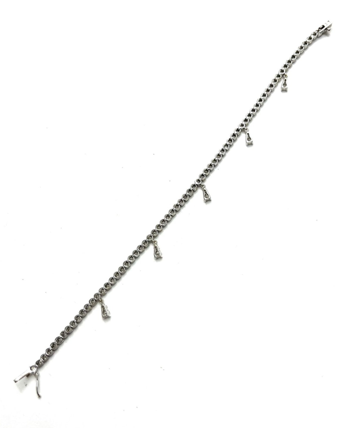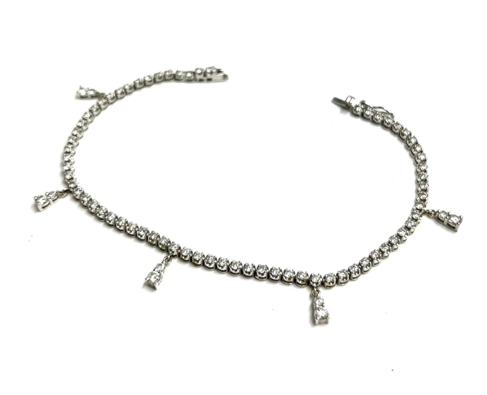 Questo splendido bracciale tennis in oro bianco 750/1000 (18 carati) rappresenta un perfetto connubio di eleganza e design sofisticato. Arricchito da cinque pendenti decorativi, costituiti da due diamanti naturali, è un'espressione di raffinata maestria artigianale.