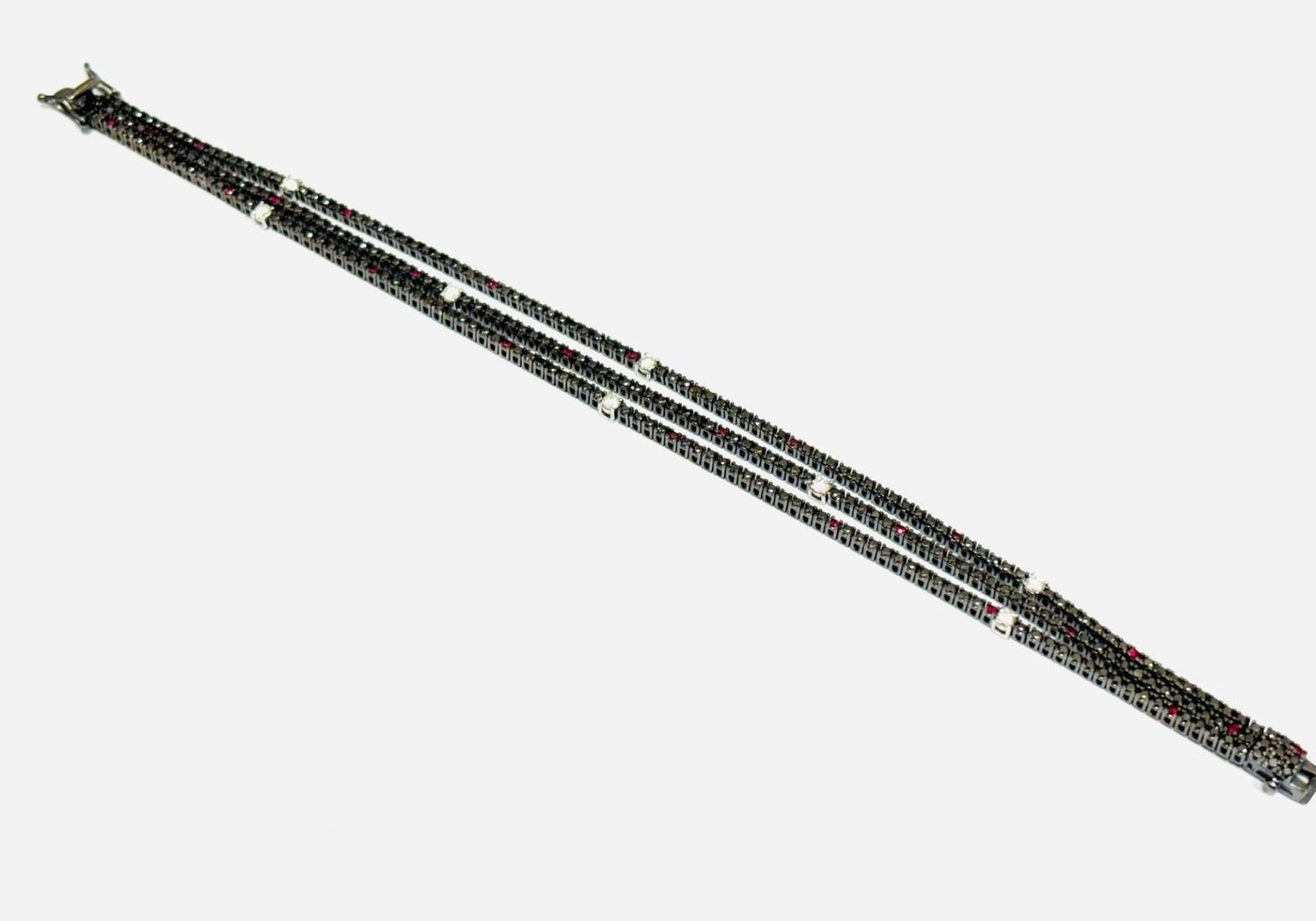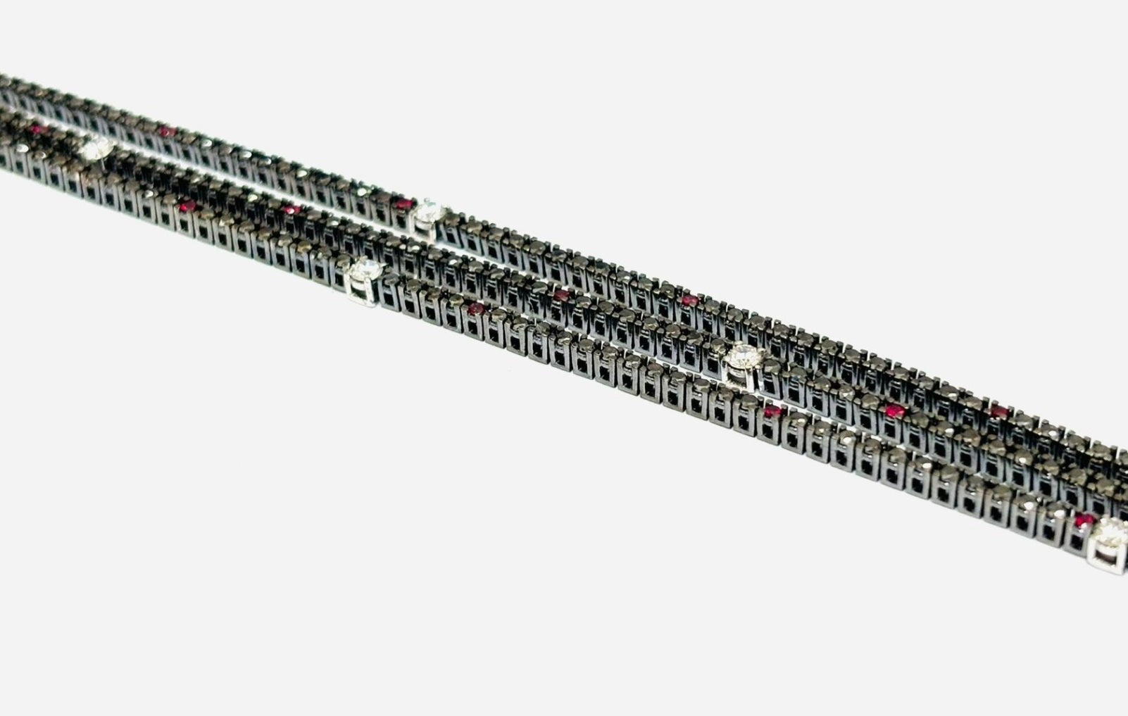 Bracciale tennis 3 file con diamanti neri 8.20 ct, bianchi 0.70 ct e rubini 0.65 in oro bianco brunito 18 kt