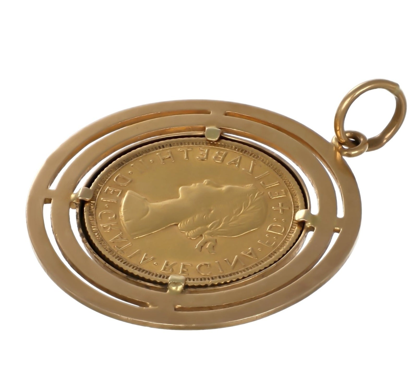 Ciondolo in oro giallo 18 carati con moneta Sterlina 22 Kt incastonata