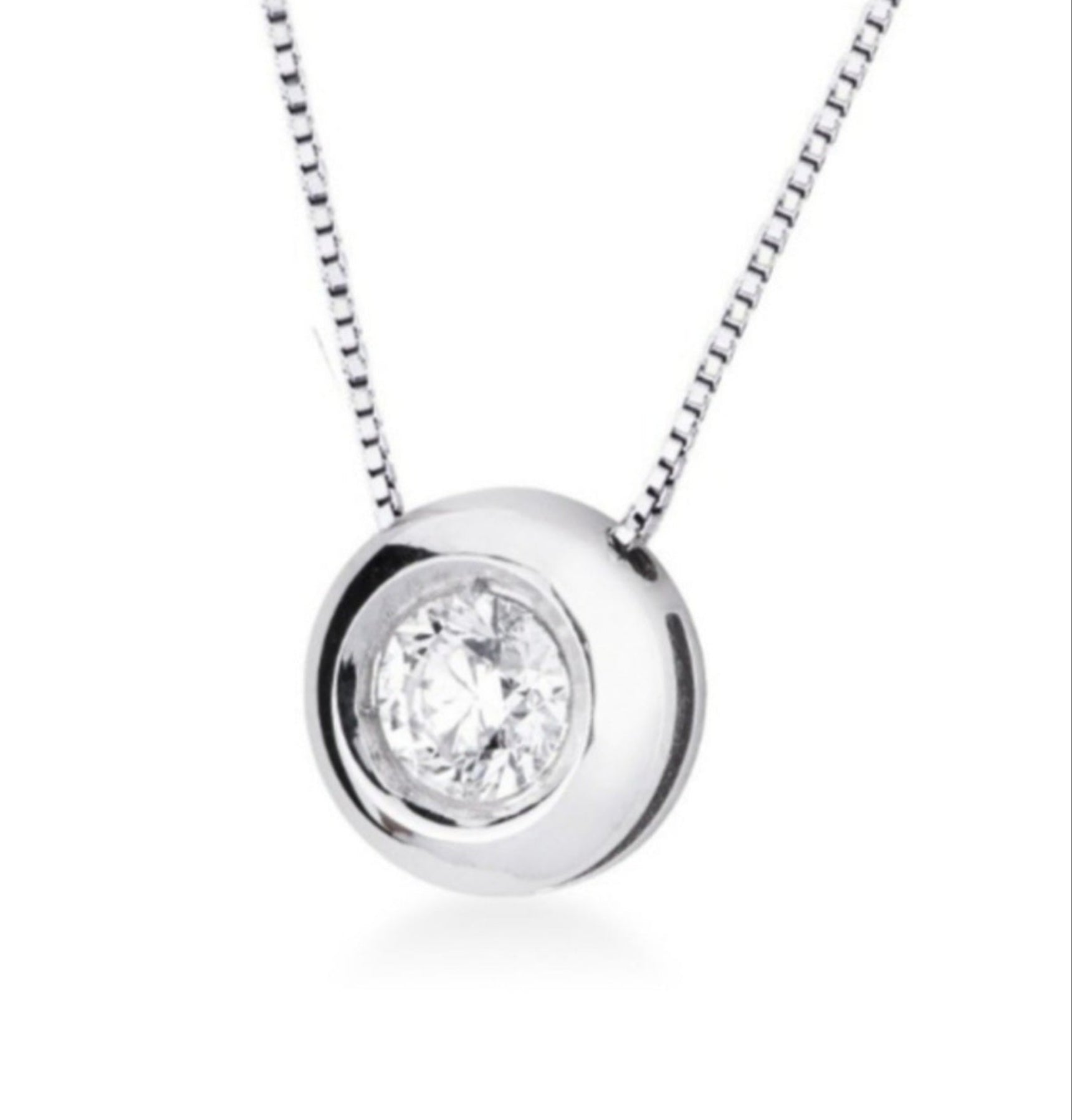 Pendente Punto Luce Cipollina molto elegante e raffinato, con piccolo diamante da 0.02 carati. Questa collana con punto luce rientra nella categoria del punto luce piccolo, grazie al diamante di carature inferiore ai 0.10 carati. Ha una montatura a cipollina che lo rende molto più voluminoso ed importante come gioiello, raddoppiandone il diametro. La montatura a cipollina è molto bella e dal look un po' classico se vogliamo, è adatta ad una ragazza giovane per la dimensione del diamante, eppure ad una signora per lo stile del gioiello, è una regalo perfetto per una laurea o un compleanno