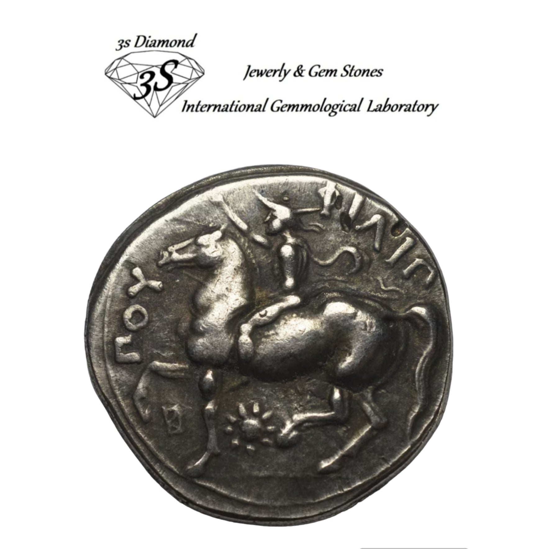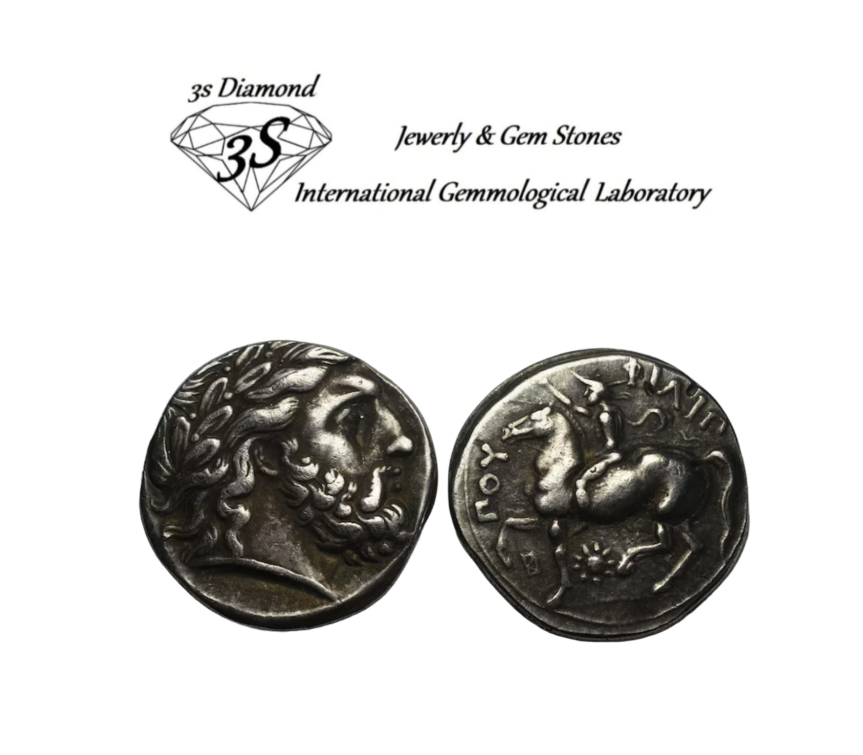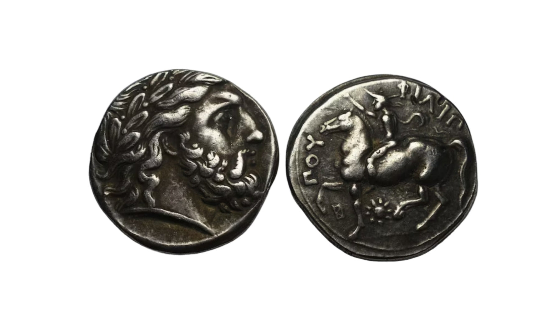 La moneta raffigura la testa di Zeus e del re Filippo II a cavallo sul rovescio, con iscrizione.